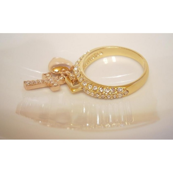 Inelul este placat cu aur de 18K si prezinta marca 18KRGP. Este decorat cu cristale Cubic Zirconia Simulant Diamond. Prezinta accesorii inimioara si cruciulita din acelasi material mentionat mai sus. Marime : 8 US size.(diametru = 18.19 mm).